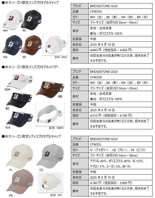 ブリヂストンスポーツ株式会社は、同社と契約するプロゴルファーが秋冬シーズンに着用する限定モデルのキャップとバイザーを、2025年9月10日に発売します。