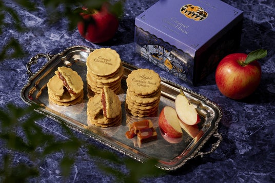 このパーティボックスには、ブランドの看板商品「キャラメルサンドクッキー」と、先行して楽しめる季節限定の**「キャラメルサンドクッキー アップル」**が入っています。