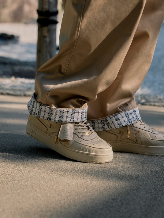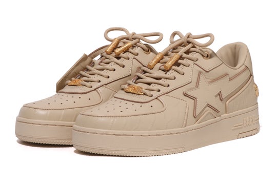 今季は、エンボス加工を施したクロコダイルカーフスキンを使用した「BAPE STA™」が初登場。ベージュにゴールドの装飾をあしらい、ラグジュアリーな一足に仕上がっています。