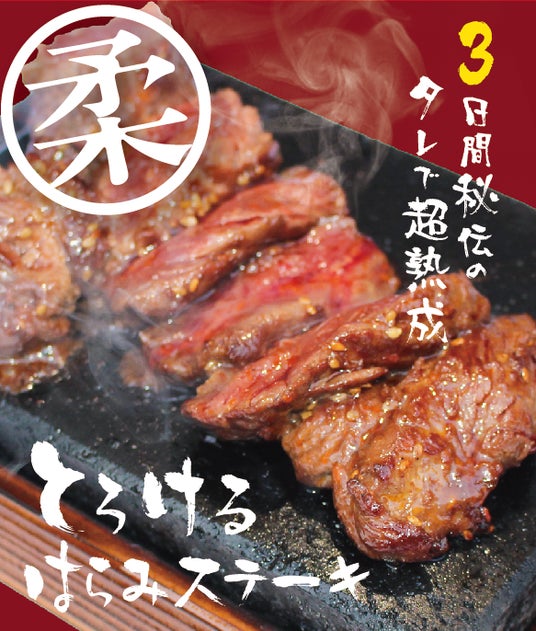 独自の調理技術と秘伝のタレで仕上げた「とろけるハラミステーキ」は、旨みが凝縮されていながら、まるでとろけるような柔らかさが特徴で、品薄になるほど大好評のメニューです。