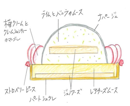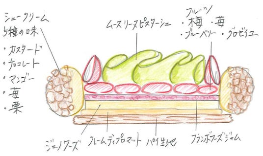- サントノーレピスタチオフランボワーズ(7,000円): チョコ細工のタクト(指揮棒)をモチーフにした、ピスタチオとフランボワーズの組み合わせが絶妙なサントノーレ。