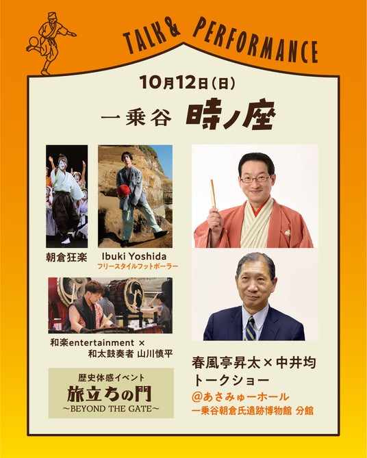 戦国武士のたしなみである「蹴鞠」にちなみ、フリースタイルフットボール世界王者・吉田伊吹氏によるスペシャルパフォーマンスが披露されます。さらに、落語家で一乗谷朝倉氏遺跡名誉お屋形さまの春風亭昇太師匠と城郭研究の第一人者・中井均氏による貴重なトークショーも開催されます(事前申込制)。