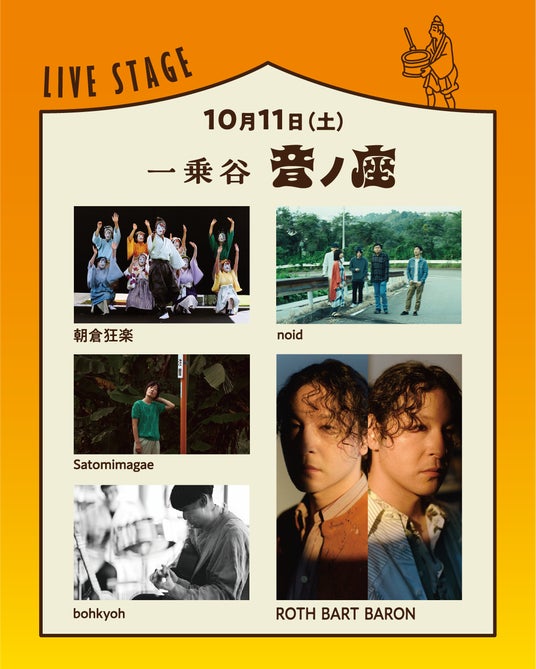 1日目の**10月11日(土)**は、秋の里山の風景に寄り添う「一乗谷 音ノ座」がテーマ。歴史ある遺跡に溶け込むような、アンビエントな音楽が一日中ステージを彩ります。
