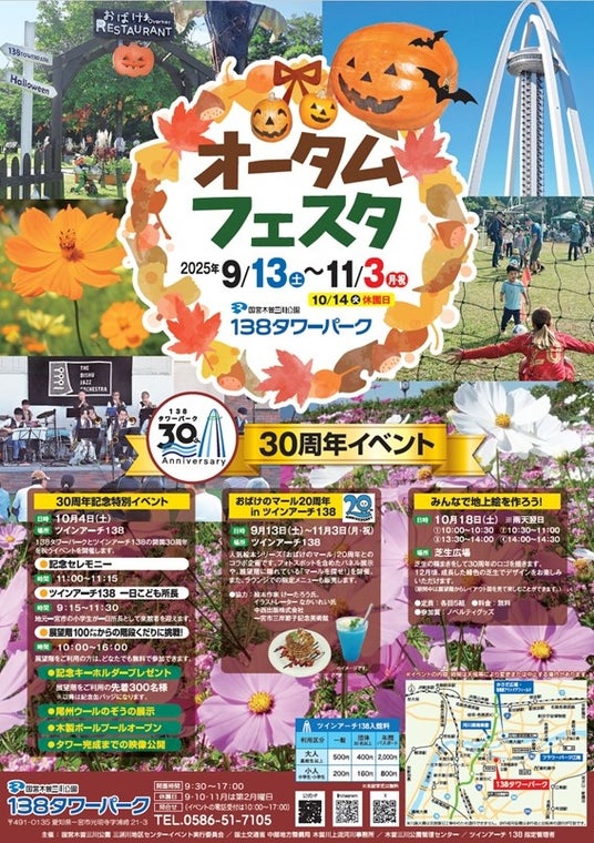 愛知県一宮市にある138タワーパークでは、9月13日(土)から11月3日(月・祝)まで「オータムフェスタ」が開催中です。コスモスが見頃を迎えるこの時期、今年は開園30周年を記念した特別なイベントも盛りだくさんです。