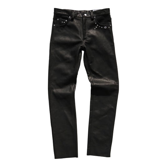 「THE LONDON LEATHERMAN」の定番的な5ポケット仕様のレザーパンツを、「PEEL&LIFT」がスタッズカスタムした限定アイテムです。裾はふらしになっています。英国製。