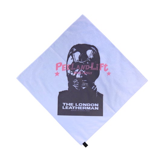 「THE LONDON LEATHERMAN」のアイコニックなレザーマスクのグラフィックに「PEEL&LIFT」のカートゥーン調のロゴを組み合わせたバンダナです。