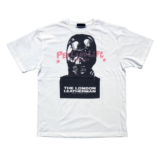 「THE LONDON LEATHERMAN」のアイコニックなレザーマスクのグラフィックに「PEEL&LIFT」のカートゥーン調のロゴを組み合わせたTシャツです。