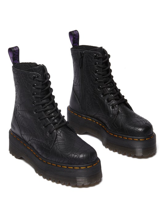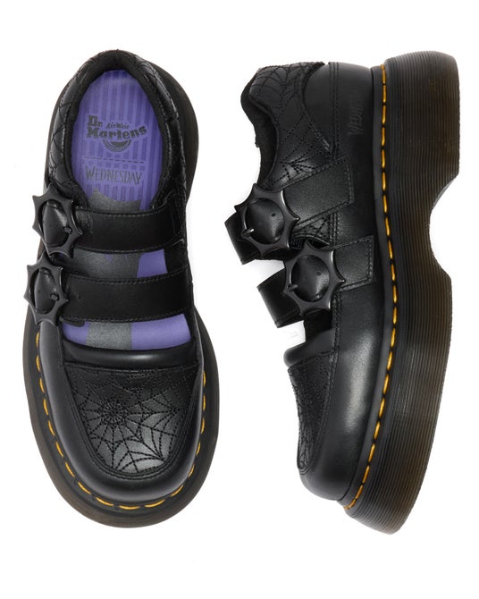 • JADON Wednesday(厚底ブーツ): ウェンズデーとイーニッドの部屋のステンドグラスをモチーフにした蜘蛛の巣の刺繍がアッパーに施され、シューレースには取り外し可能なステンドグラスチャームが揺れます。バックストラップにはネヴァーモア・アカデミーの紋章がプリントされ、細部までこだわりが詰まった一足です。