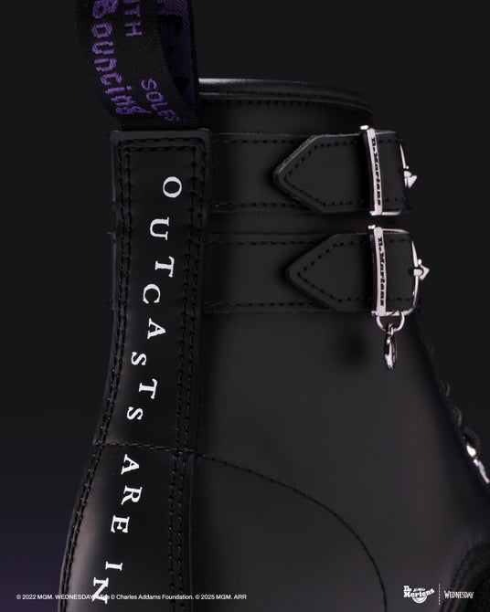 今回のコレクションでは、ドクターマーチンの定番アイテムが『ウェンズデー』からインスピレーションを得たディテールで大胆にアップデートされています。