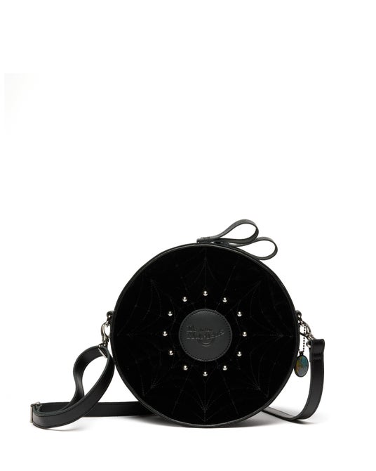 さらに、コレクションには円形シルエットのバックパックも登場。スパイダーウェブの刺繍とスタッズが目を引き、取り外し可能なストラップやチャームなど、細部までこだわったデザインです。