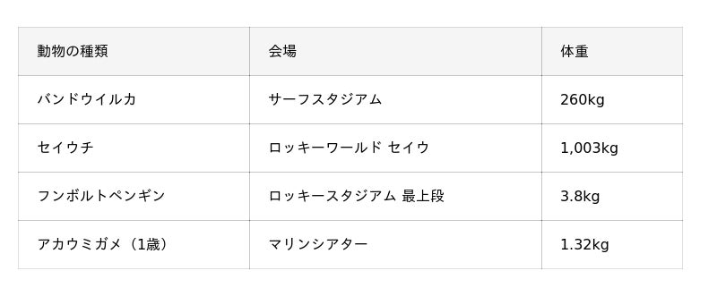 | バンドウイルカ | ハンドサインで特製の体重計に誘導し、自ら乗る。 | 体が大きく持ち上げられないため、トレーニングを活かして計測。 |
