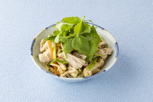 秋から冬の期間に宮城県でよく食べられている「せり」を使用したサラダ。柔らかく仕立てた蒸し鶏とせりを混ぜ合わせ、だしの風味が感じられるだし醤油であえました。