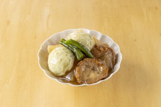 山形県鶴岡市産の、甘みと香りの強さが特長的な「だだちゃ豆」をすり潰し、白身魚のすり身に練りこみ、蒸し焼きにしたしんじょと出汁がしみてふんわりとした食感の油麸を合わせた一品。