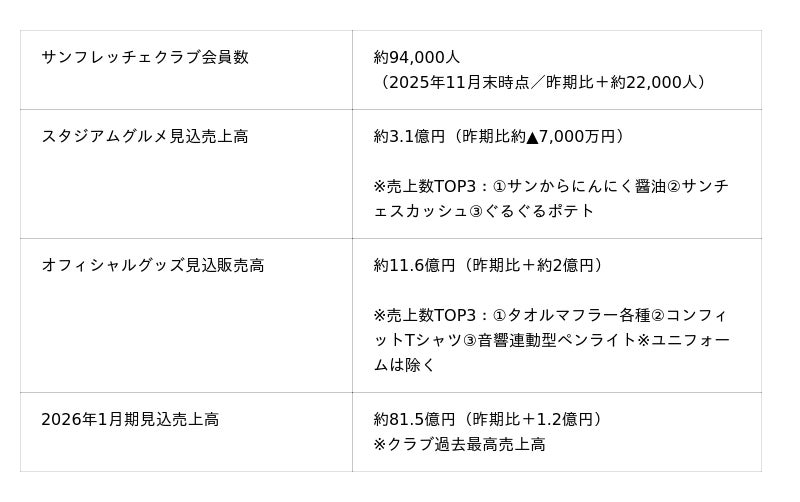 サンフレッチェクラブ会員数は引き続き順調に伸張し、約94,000人と来年での10万人達成が間近。オフィシャルグッズは、ユニフォームの販売数増加やルヴァンカップ優勝記念グッズ、背番号の圧着加工ができるコンフィットシャツの人気が後押しし、今期約11.6億円での着地見込み。昨年に続き過去最高を更新する見込みです。