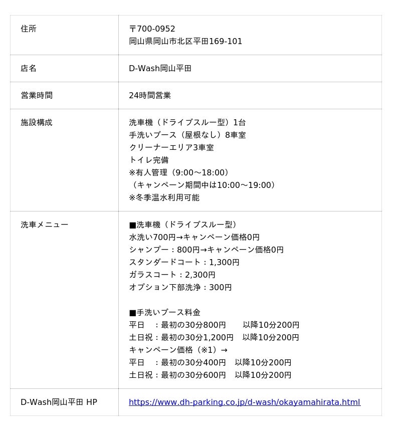 大和ハウスグループの大和ハウスパーキング株式会社(本社:東京都港区、社長:酒井太)は、2026年3月19日、岡山県内で当社初となる、純水洗車場「D-Wash(ディー・ウォッシュ)岡山平田」をオープンします。