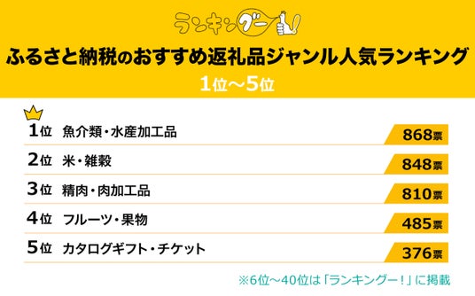 ランキングー!では、ふるさと納税のおすすめ返礼品ジャンルをピックアップし、ランキングを調査。20代以上の男女(性別回答しないを含む)8,295名にアンケートを行い、TOP40を決定しました。ここではTOP5をご紹介します。