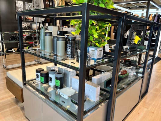 プラザアパレルやグッズは店内のアイランドスペースに展示。実際に手に取って確かめやすいレイアウトです。