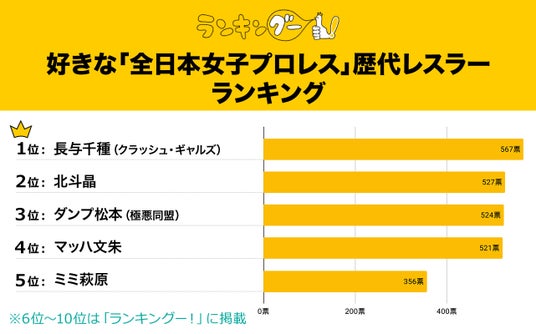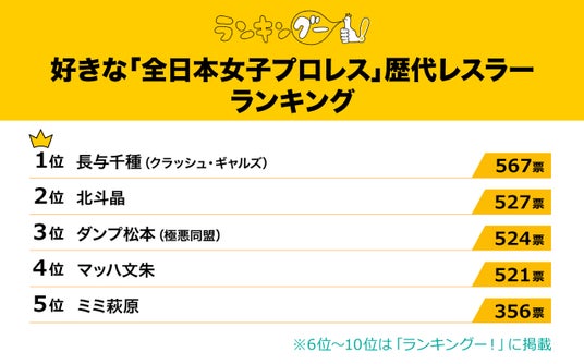 ランキングー!では『好きな「全日本女子プロレス」歴代レスラーランキング』を調査。全年代の男女(性別回答しないを含む)7,955名にアンケートを行い、TOP10を決定しました。ここではTOP5をご紹介します。
