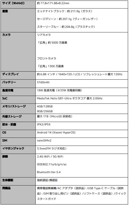 小米技術日本株式会社(以下「シャオミ・ジャパン」、本社:東京都港区、取締役社長:大沼 彰)は、見やすい大型ディスプレイにスリムな本体設計の「Redmi 14C」を10月17日(木)より発売開始します。カラーバリエーションは3色を用意。市場想定価格は4GB/128GB版が17,980円(税込み)、8GB/256GB版が23,980円(税込み)です。