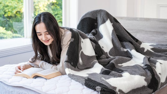 ムーミンシルエット柄のあったか毛布、シープ調のもふもふ感と軽さがうれしい