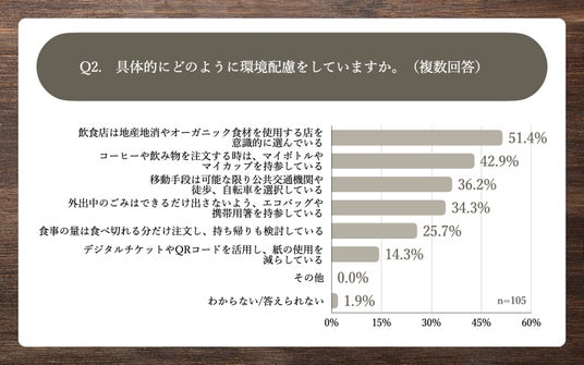 Q1で「よく配慮する」「時々配慮する」と回答した方に、「Q2.具体的にどのように環境配慮をしていますか。(複数回答)」(n=105)と質問したところ、「飲食店は地産地消やオーガニック食材を使用する店を意識的に選んでいる」が51.4%、「コーヒーや飲み物を注文する時は、マイボトルやマイカップを持参している」が42.9%、「移動手段は可能な限り公共交通機関や徒歩、自転車を選択している」が36.2%という回答となりました。