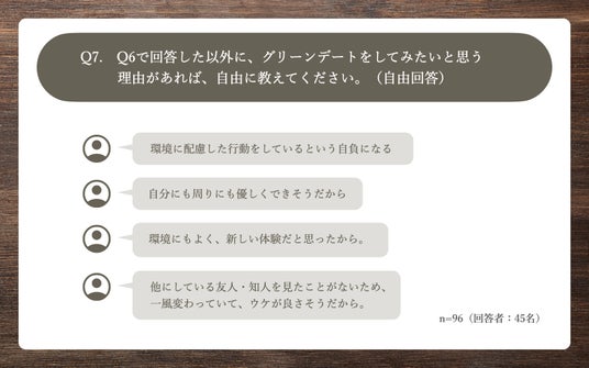 Q6で「わからない/答えられない」以外を回答した方に、「Q7.Q6で回答した以外に、グリーンデートをしてみたいと思う理由があれば、自由に教えてください。(自由回答)」(n=96)と質問したところ、「環境に配慮した行動をしているという自負になる」や「自分にも周りにも優しくできそうだから」など45の回答を得ることができました。