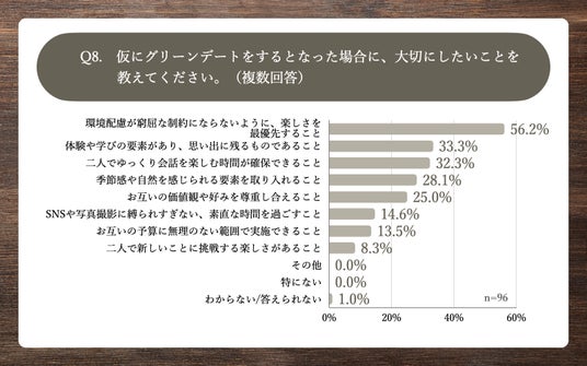 Q5で「非常にそう思う」「ややそう思う」と回答した方に、「Q8.仮にグリーンデートをするとなった場合に、大切にしたいことを教えてください。(複数回答)」(n=96)と質問したところ、「環境配慮が窮屈な制約にならないように、楽しさを最優先すること」が56.2%、「体験や学びの要素があり、思い出に残るものであること」が33.3%、「二人でゆっくり会話を楽しむ時間が確保できること」が32.3%という回答となりました。
