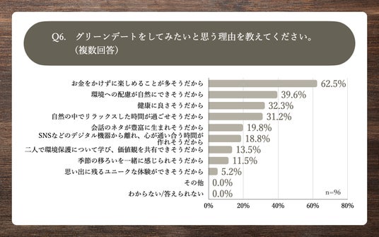 Q5で「非常にそう思う」「ややそう思う」と回答した方に、「Q6.グリーンデートをしてみたいと思う理由を教えてください。(複数回答)」(n=96)と質問したところ、「お金をかけずに楽しめることが多そうだから」が62.5%、「環境への配慮が自然にできそうだから」が39.6%、「健康に良さそうだから」が32.3%という回答となりました。