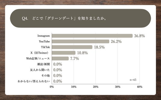 Q3で「よく知っている」と回答した方に、「Q4.どこで「グリーンデート」を知りましたか。」(n=65)と質問したところ、「Instagram」が36.8%、「YouTube」が26.2%、「TikTok」が18.5%という回答となりました。