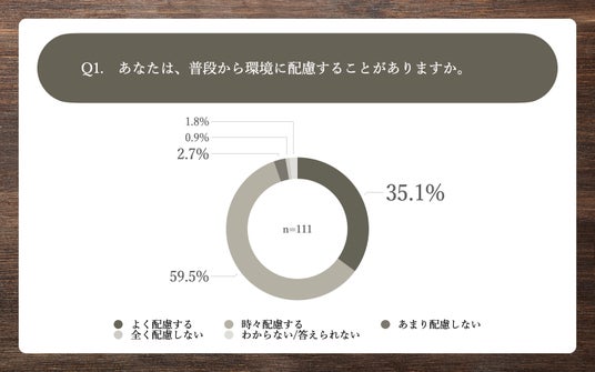 「Q1.あなたは、普段から環境に配慮することがありますか。」(n=111)と質問したところ、「よく配慮する」が35.1%、「時々配慮する」が59.5%という回答となりました。