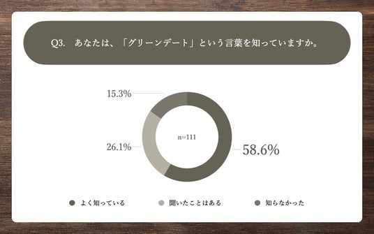 「Q3.あなたは、「グリーンデート」という言葉を知っていますか。」(n=111)と質問したところ、「よく知っている」が58.6%、「聞いたことはある」が26.1%という回答となりました。
