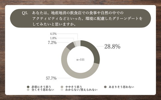 「Q5.あなたは、地産地消の飲食店での食事や自然の中でのアクティビティなどといった、環境に配慮したグリーンデートをしてみたいと思いますか。」(n=111)と質問したところ、「非常にそう思う」が28.8%、「ややそう思う」が57.7%という回答となりました。
