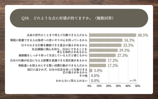 Q9で「とても好感が持てる」「やや好感が持てる」と回答した方に、「Q10.どのような点に好感が持てますか。(複数回答)」(n=99)と質問したところ、「未来の世代のことまで考えて行動できる人だから」が48.5%、「環境に配慮できる人は他者への思いやりの心を持っているから」が34.3%、「日々の小さな行動を継続できる意志の強さがあるから」が33.3%という回答となりました。