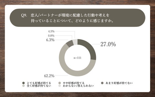 「Q9.恋人/パートナーが環境に配慮した行動や考えを持っていることについて、どのように感じますか。」(n=111)と質問したところ、「とても好感が持てる」が27.0%、「やや好感が持てる」が62.2%という回答となりました。
