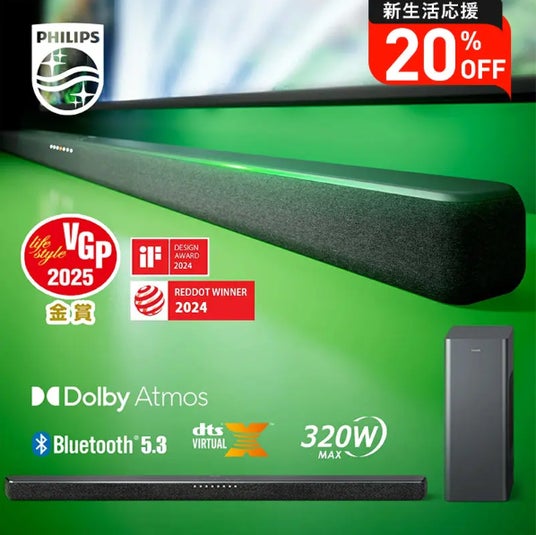 製品特徴:PHILIPS史上極細のサウンドバー、VGP2025金賞受賞、Dolby Atmos対応