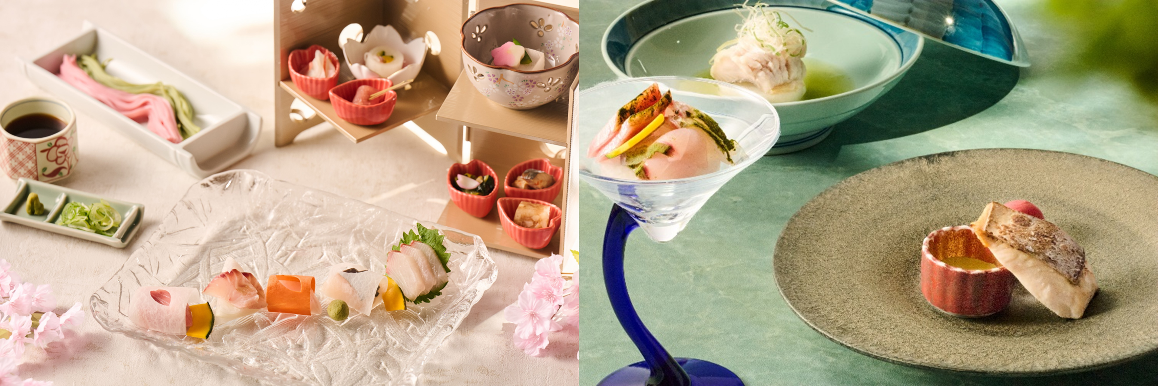 写真左:「桜奏でる会席」 写真右:「お茶と新緑が奏でる会席」 イメージ うららかな春に咲き誇る桜と、新緑への移ろいを新茶で表現した本プラン。3月1日~4月7日までの期間は、伊東に咲き誇る桜をテーマに、お花見をイメージした前菜のお花見箱から始まり、舞い散る桜のように盛りつけた旬魚のお造り、桜の葉で麹焼きにした鰆の焼物、桜の香りで蒸した鮑や牛肉、桜の花と葉をイメージした桜二味蕎麦など、目と舌で桜をお楽しみいただく「桜奏でる会席」をご提供いたします。そして4月8日以降は、新緑に染まる伊豆を地元産のお茶を使い、前菜にはお茶会の食事をイメージした華やかな盛り込み皿、昆布締めにしたお茶が香る旬魚のお造り、お茶で仕立てた鮎魚女、伊東を代表するお茶「ぐり茶」を使ったお造りやしゃぶしゃぶなど、新緑に染まる季節を地元産のお茶とともに楽しむ「お茶と新緑が奏でる会席」をご提供いたします。桜咲く春と新緑に染まる春、季節の移り変わりを料理長の豊かな発想で表現された、旬をお楽しみいただく会席料理となっています。