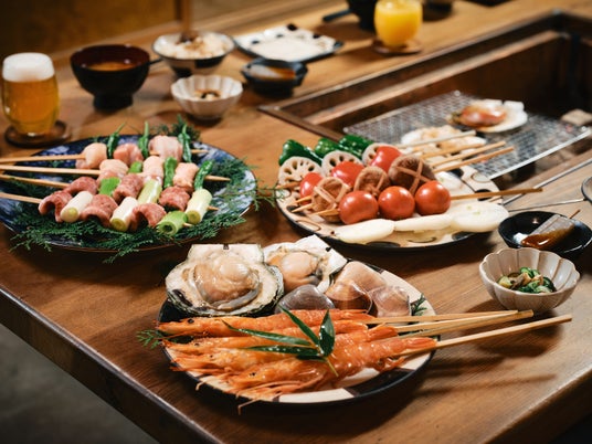 ●地産の野菜/海鮮/肉の串盛り皿盛り計10種