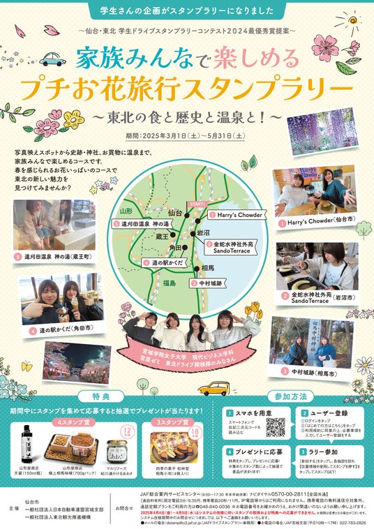JAF(一般社団法人日本自動車連盟)宮城支部(支部長 橘川泰介)は、昨年12月に開催された「仙台・東北 学生ドライブスタンプラリーコンテスト2024」(主催:仙台市、JAF宮城支部、(一社)東北観光推進機構)にて、最優秀賞を獲得した宮城学院女子大学「東北ドライブ探検隊」考案の「家族みんなで楽しめるプチお花旅行スタンプラリー」を5月31日(土)まで開催しています。