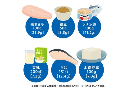 アスリートの男性は、体重1kgあたり2gのタンパク質摂取(※4※5)、美容・健康のため週5回30分程度の運動をする女性は、体重1kgあたり0.8~1.1gのタンパク質摂取が(※4※6)必要と言われています。本製品は、1食40gで10.9gの自然由来の植物性タンパク質と6.1gの食物繊維を含むため、下のような食材と合わせることで効率よく栄養補給できます。