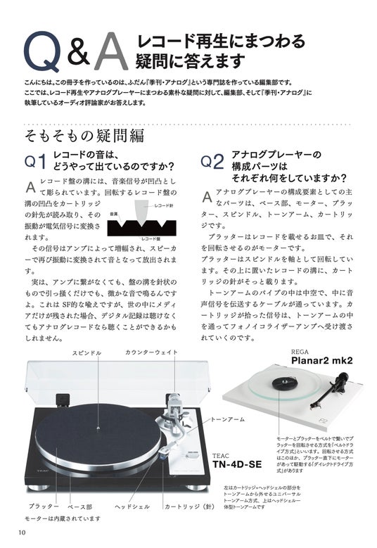 アナログレコードっていいな、そう思ってレコードを買ってみたけれど、プレーヤーは持っていない。そんな10代・20代の皆さんに向けて、アナログプレーヤーの存在と、その選び方、聴き方を知っていただこうと、音元出版の専門誌「季刊・アナログ」の制作に携わる編集部がお届けする、無料の小冊子「はじめてのアナログプレーヤー」が創刊となりました。ディスクユニオン、HMV、タワーレコード、フェイスレコード、ビームス レコーズ、蔦屋家電、ヨドバシカメラ、ビックカメラ、オーディオユニオンなどの店舗で、2024年10月19日(土)より順次配布スタート致します。スマホで読めるPDF版もご案内しています。音楽をレコードで楽しんでみたい皆さん、ぜひお手に取ってご覧ください。