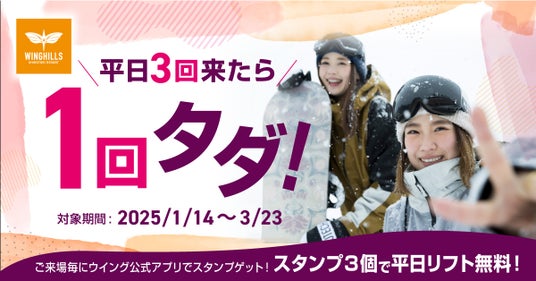 ウイングヒルズでは平日にご来場し、リフト1日券をご購入の方を対象に、平日3回のご来場で1回平日リフト券が無料になるキャンペーンを実施いたします! 【対象期間】2025/1/14~3/23の平日