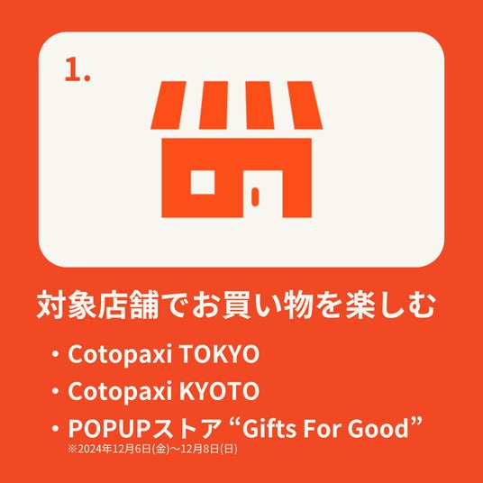 期間中にCotopaxi直営店(東京/京都)またはPOPUPストア(以下PUS)で商品をご購入いただいた方を対象に、抽選で素敵なプレゼントをお送りいたします。