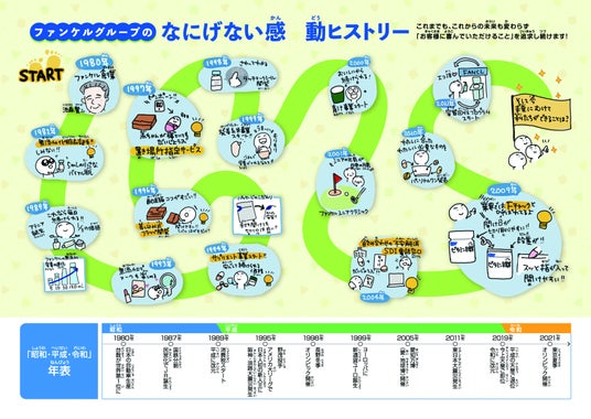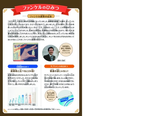 本品は当社の創業45周年を記念して製作しました。表紙には歴代の代表製品、裏表紙には現在の人気製品を掲載。中面ではこれまでのファンケルのあゆみを親しみやすいイラストで表現し、創業の由来なども「ファンケルのひみつ」として紹介しています。