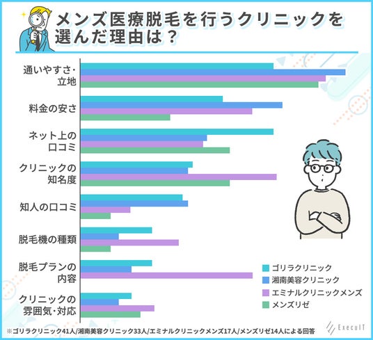メンズ医療脱毛の人気ランキング上位のクリニックを選んだ理由についても質問してみると、どのクリニックも共通して「通いやすさ・立地」と回答した方が最も多い結果となりました。