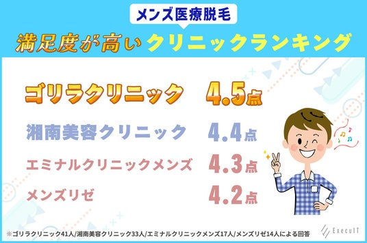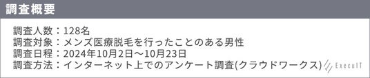 メンズ脱毛や女性の医療脱毛に関する総合情報メディアを運営している株式会社ExecuIT(https://execuit.wpx.jp)では、メンズ医療脱毛を行ったことがある男性128名に「どのクリニックを受診したか・メンズ脱毛に満足したか」などに関するアンケート調査を実施しました。