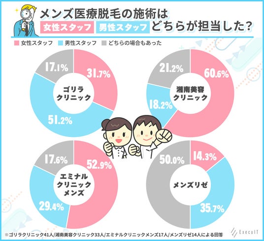 今回調査したメンズ医療脱毛クリニックでは、女性スタッフによる施術が多かったのが「湘南美容クリニック」と「エミナルクリニックメンズ」、男性スタッフによる施術が多かったのが「ゴリラクリニック」、女性スタッフ・男性スタッフどちらが施術する場合もあるという回答が多かったのが「メンズリゼ」という結果になりました。