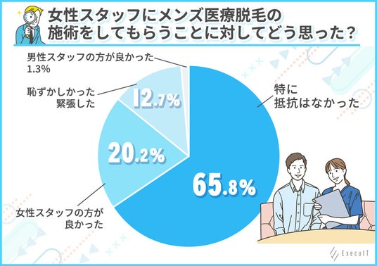 女性スタッフによるメンズ医療脱毛の施術を受けることに対して、65.8%の方が「特に抵抗はなかった」、20.2%の方が「女性スタッフの方が良かった」と回答しており、女性スタッフに施術を担当してもらうことに抵抗がある男性は少ないということが分かりました。