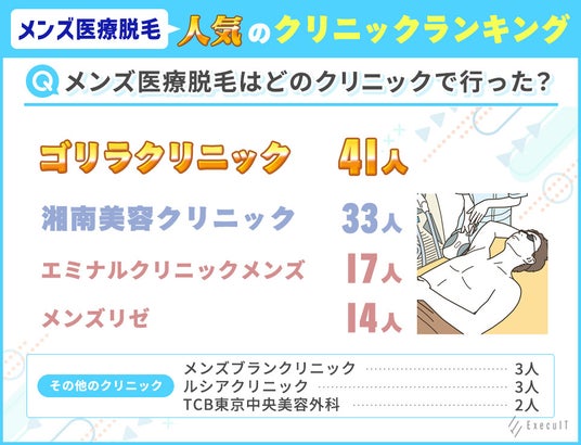 メンズ医療脱毛を行ったことのある男性にどのクリニックを受診したかを調査したところ、128人中41人が回答した「ゴリラクリニック」が人気ナンバーワンでした。