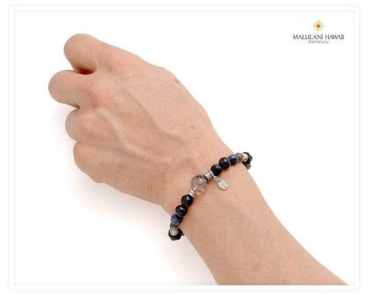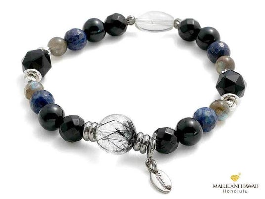 最強のパワーストーンとも称されるルチルクォーツを冠に、ブルー&ブラック系のストーンをバランス良く配したブレスレットは、色味のトーンを揃えたユニセックスな仕立て。
