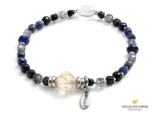 ルチルクオーツを冠に、ブラック系、ブルー系でまとめたストーンを、スリムに仕立てたブレスレット。才能開花や好転を促すストーンは、お仕事運や開運を願う方におすすめです。
